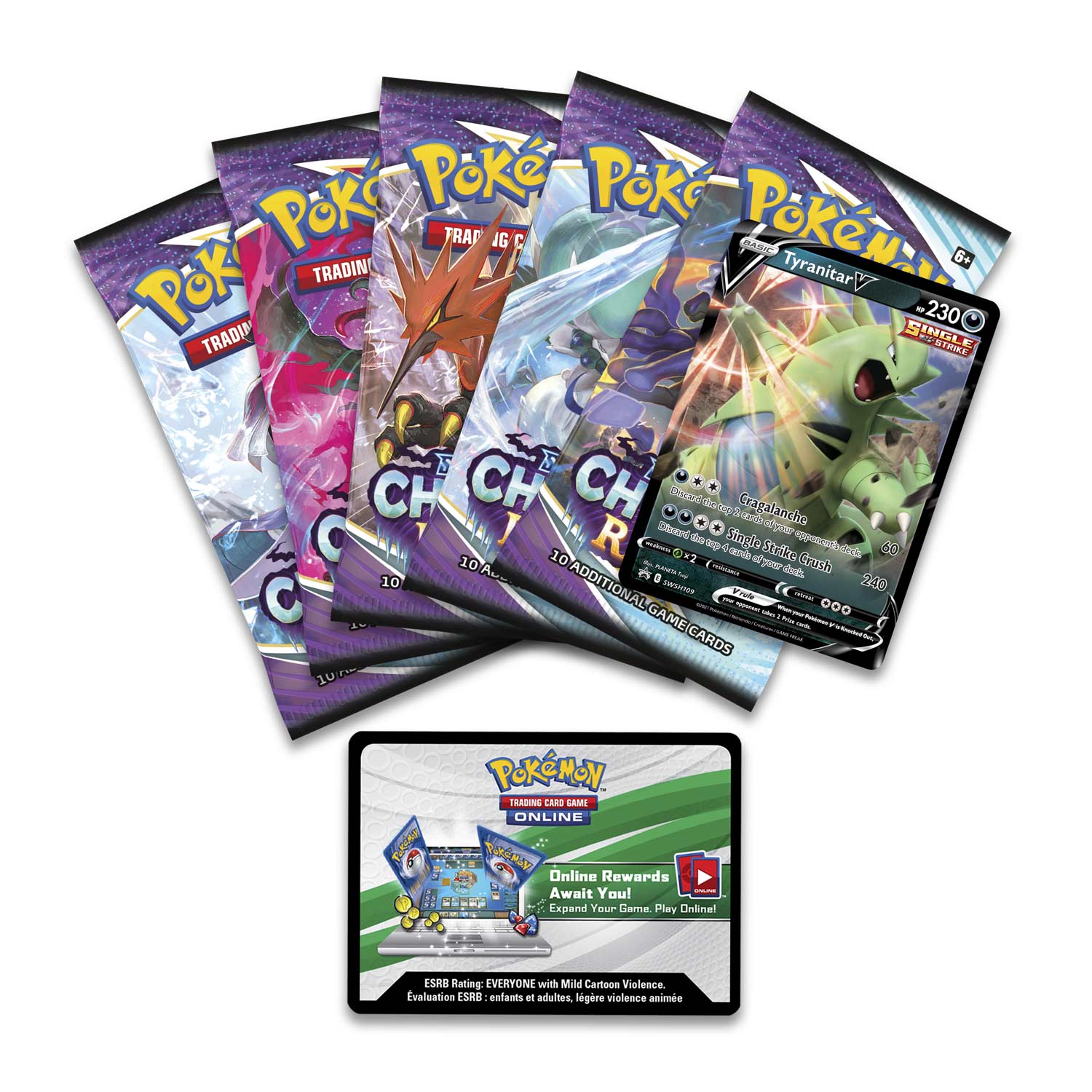 The time of hard-fighting Battle Styles is upon you, with new Pokémon that strike hard and strike often—such as this monster of mayhem! Choose the crunching power of Tyranitar V in the Pokémon Trading Card Game: V Strikers Tin. This fantastic tin contains a super-powerful Pokémon V, with the moves, the strength, and the skills to take you to the top in your next Pokémon battle!